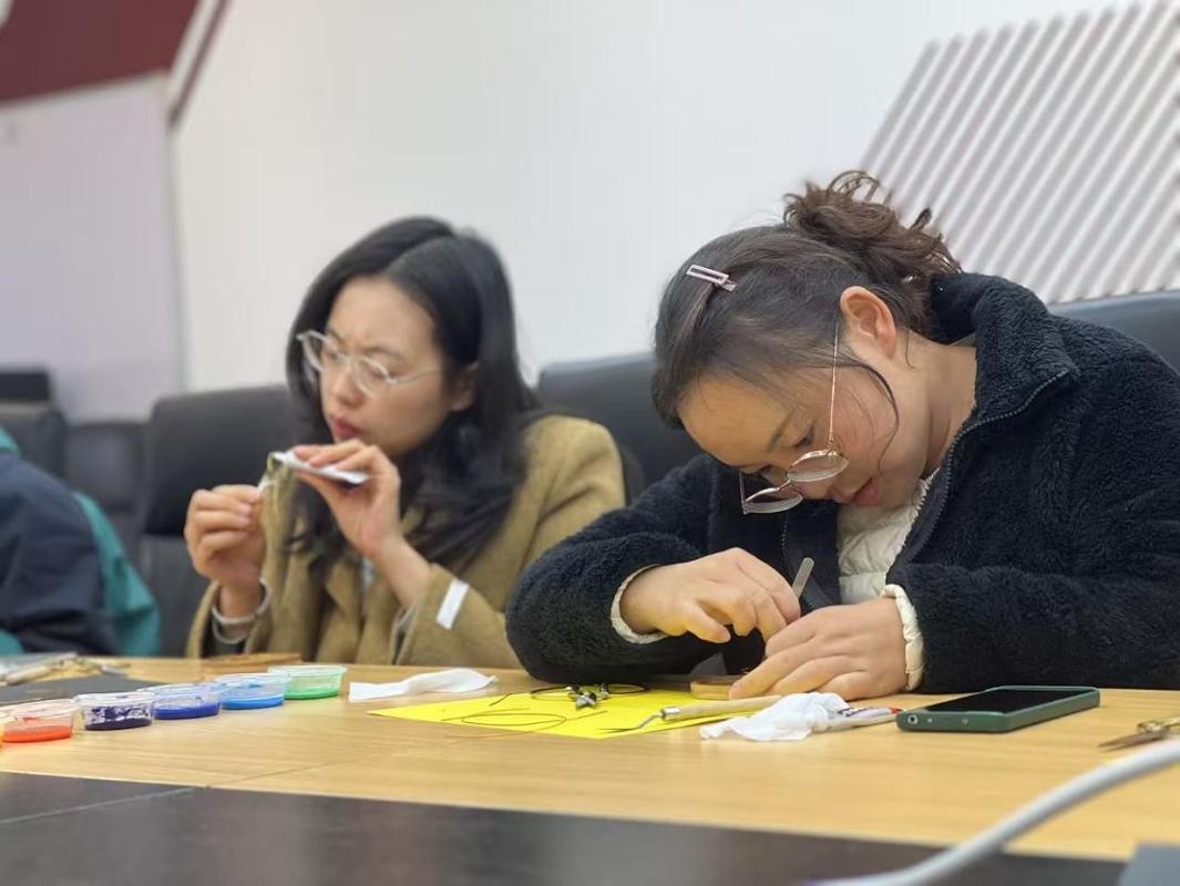 实践环节中,在郭老师及其助教的耐心指导下,教职工们认真投入创作,先是精心设计图样,再用金属丝线细心掐制轮廓,最后以细腻的手法进行点蓝上色。现场气氛活跃,大家专注创作,互相交流,感受传统工艺的独特魅力。每位老师创作的作品都展现出独特的风格,色彩渐变自然和谐,呈现出各具特色的艺术效果。